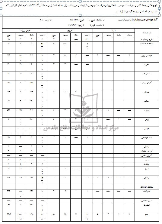 این آمار مربوط به حین عملیات تکمیلی کربلا 5 لشکر 32 انصارالحسین (ع) بوده که مربوط به تاریخ 12/7 الی 65/12/11 می باشد.در این آمار واحدهای لشکر را با ذکر پاسدار- وظیفه و بسیجی که شهید یا زخمی شده اند را مشخص کرده است.
