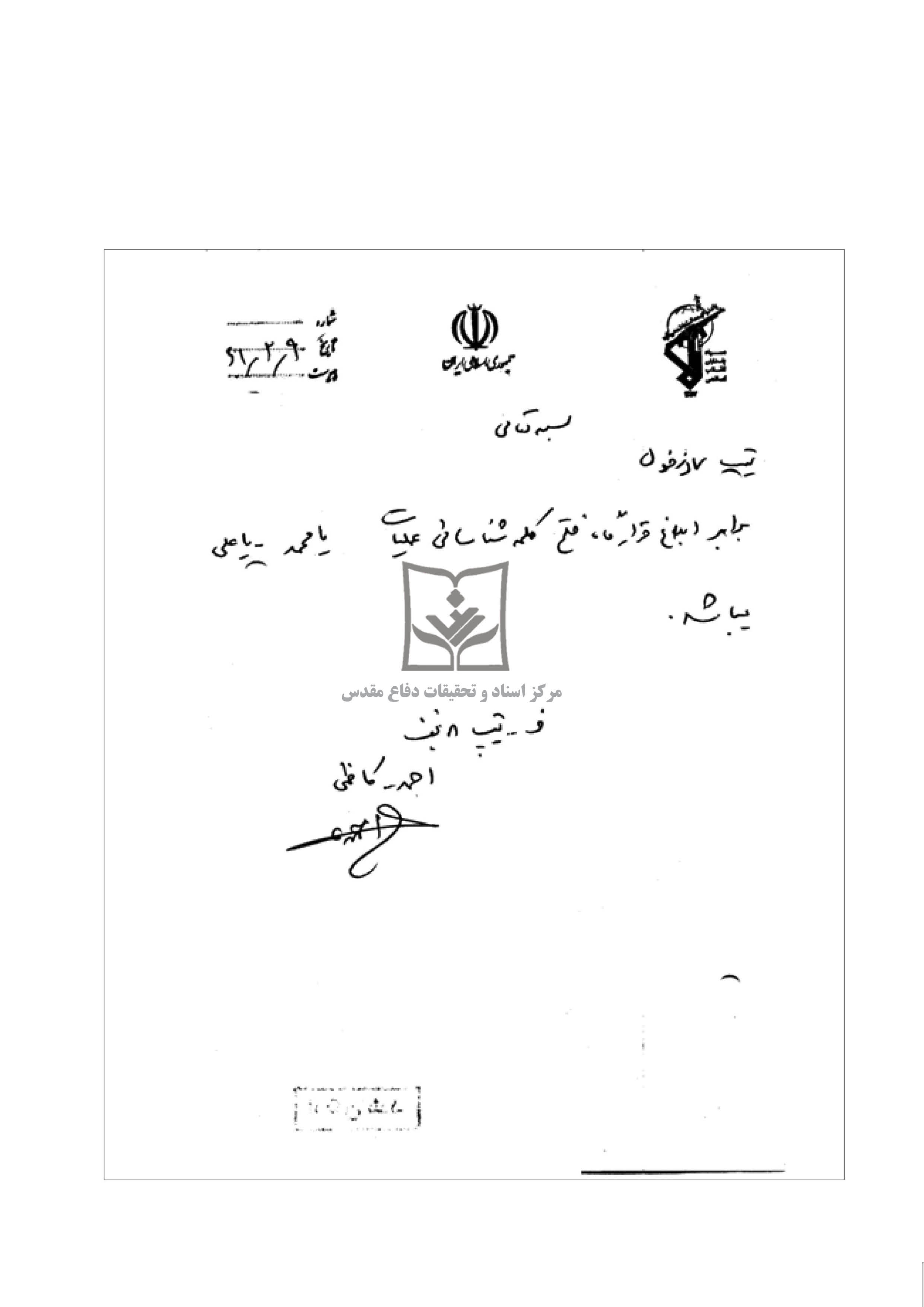 احمد کاظمی فرمانده تیپ 8 نجف اشرف برای شب اول عملیات بیت المقدس کلمه شناسایی "یا محمد یا علی" را که توسط قرارگاه فتح تعیین شده ابلاغ می کند.