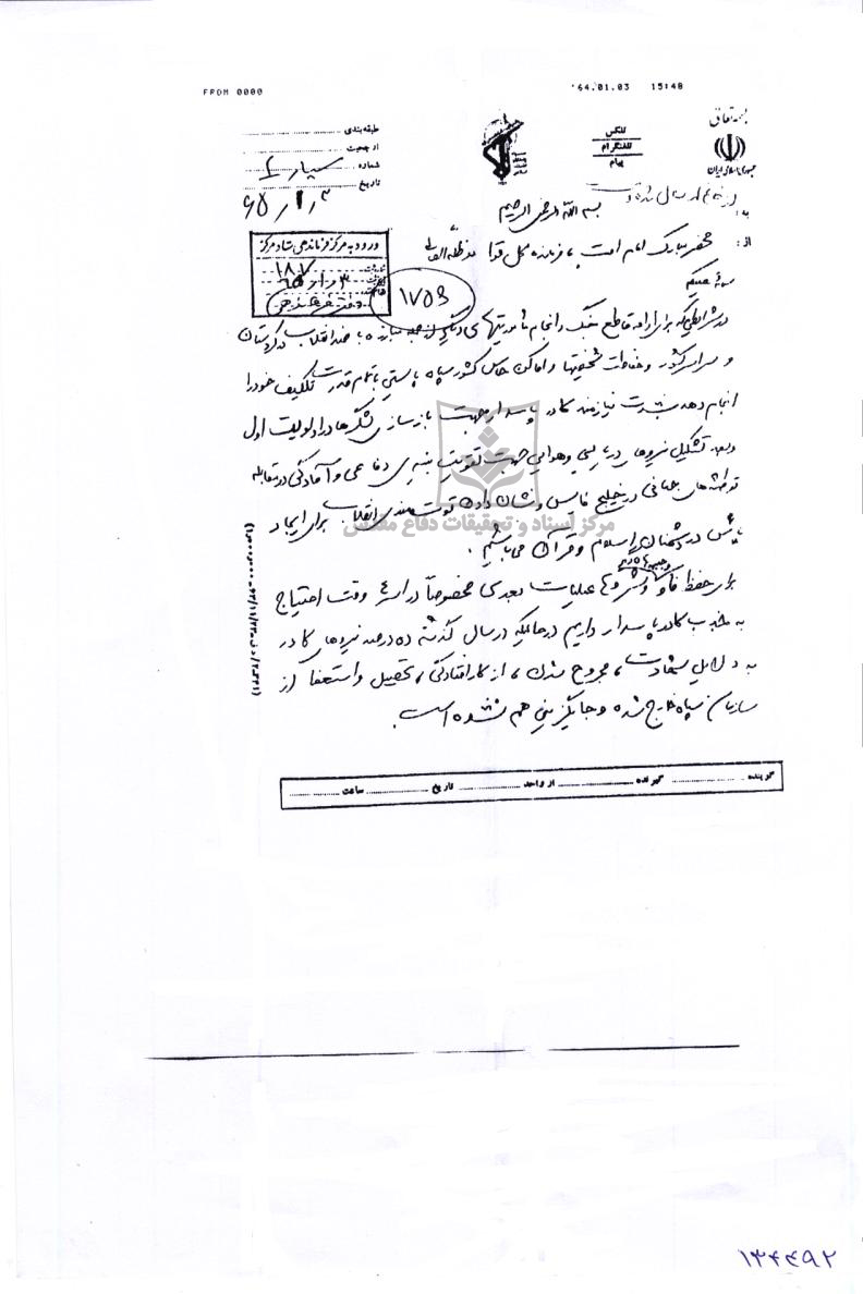 این وضعیت در شرایطی که سپاه برای ترمیم و تقویت یگانهای رزمی خود در جبهه های جنگ تحمیلی و بازسازی لشکرهای خود برای ادامه عملیات و راه اندازی سه نیروی زمینی ، هوایی و دریایی سپاه و سایرمأموریتهای محوله علاوه بر مشمول و بسیجی نیاز مبرمی به جذب نیروهای متعهد و کاردان دارد تا بتواند با کمک آنها مدیریت لازم را در کادرها بوجود آورد لذا مستدعی است در آستانه سوم شعبان میلاد بزرگ پاسدار اسلام حسین بن علی(ع) روز پاسدار بهرنحوی که مصلحت بدانید جوانان عزیز را تشویق بفرمائید تا با پیوستن به برادران رزمنده خود در سپاه پایه های مستحکم نظام دفاعی جمهوری اسلامی را مستحکم تر نموده، صف مبارزه با استکبار جهانی را قوام بیشتری بخشند.