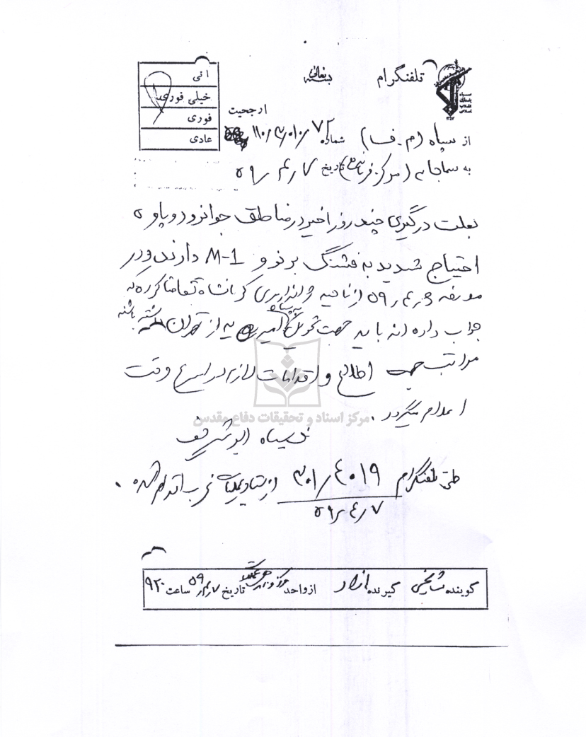 تلفنگرام با امضای ابوشریف فرماندهی سپاه و بنا به تقاضای ستاد عملیات غرب سپاه تهیه شده است.