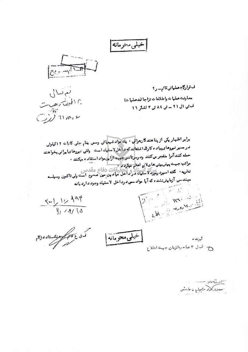 برابر اظهار یکی از پناهندگان عراقی، یک مواد شیمیایی و سمی بنام جلی کانات 12 کیلویی درمسیر نیروهای پیاده کارگذاشته اند که داخل لاستیک است  وقتی نیروهای ایرانی بخواهند حمله کنند آنرا منفجر می کنند و در سرتا سر جبهه از این مواد استفاده می‌کنند. مراتب جهت پیش بینی های لازم اعلام میگردد.
