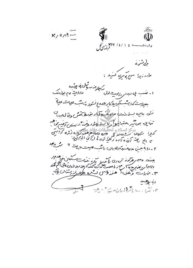 1. نصب پل دوبه‌ای در اولویت اول سه کیلومتر جنوب و یا شمال پل چوئبده در اولویت  دوم ابوشانک بدیهی است که از امشب اگر این کار شروع نشود و تا شب عملیات عملیاتی نشود بدلیل بسته شدن جاده خسروآباد به توسط آتش و احتمال بمباران تنها پل بهمن‌شیر – عقبه نیروهای ما بسته می‌شود و ضمناً از مهندسی توضیح بخواهید که چرا سرگردان شده‌اند؟ جاده وحدت هم هنوز آماده نشده که بایستی تا 48 ساعت آینده آماده وکلیة ترددها از آنجا انجام گیرد.