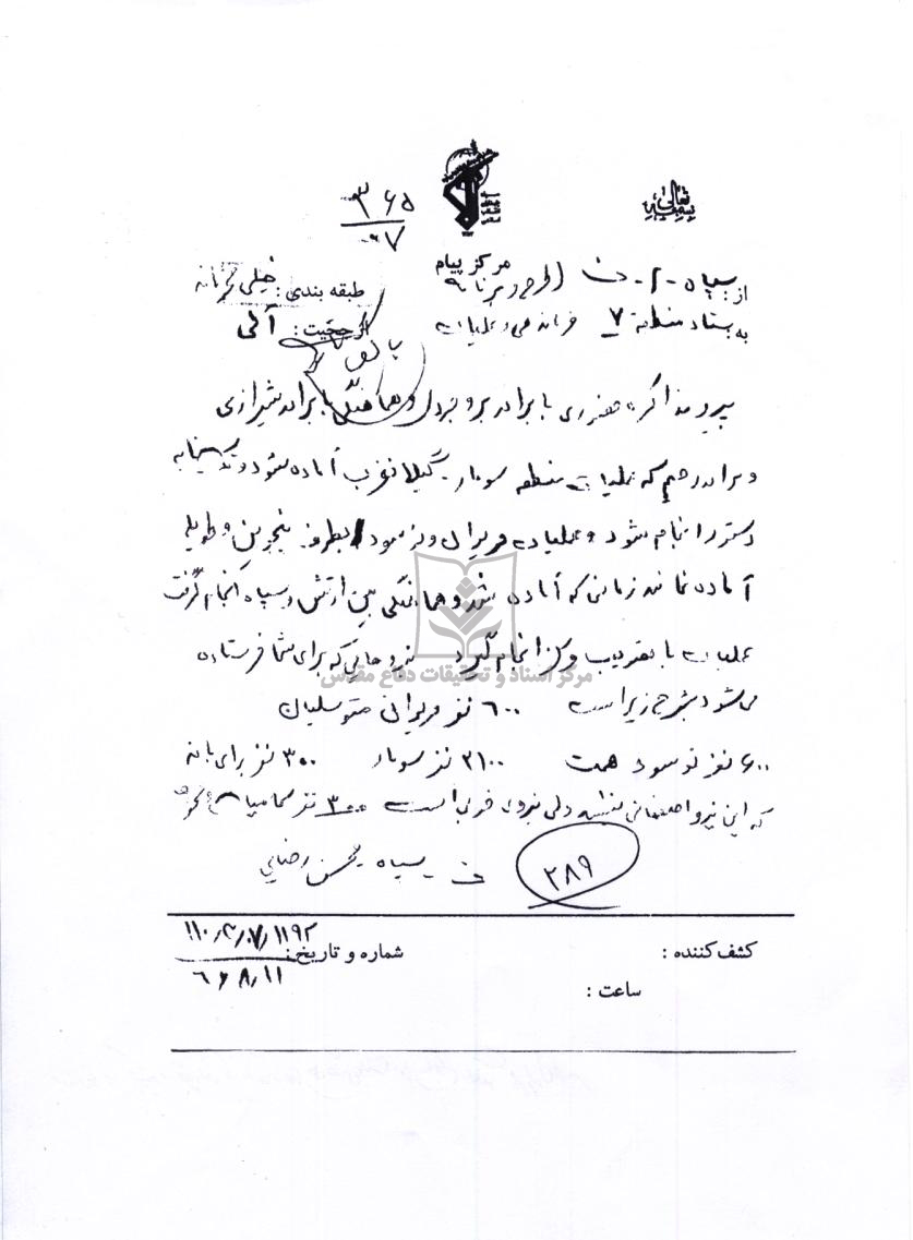 دستنوشته سپهبد شهید غلامعلی رشید درخصوص سردار رئوفینژاد