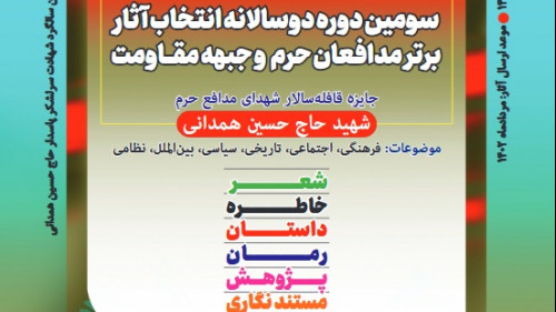 برگزیدگان بخشهای مختلف سومین دوره انتخاب آثار برتر مدافعان حرم و جبهه مقاومت؛ جایزه سردار شهید حاج حسین همدانی روز سهشنبه، 25 مهرماه از ساعت 15 در باغ موزه انقلاب اسلامی و دفاع مقدس معرفی میشوند.