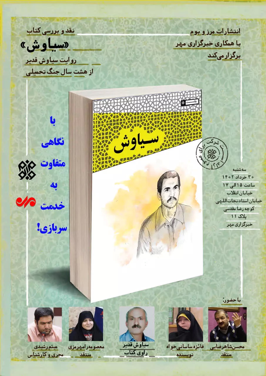 به گزارش تارنمای مرکز اسناد و تحقیقات دفاع مقدس، انتشارات مرزوبوم با همکاری خبرگزاری مهر جلسه نقد و بررسی کتاب «سیاوش» را با حضور محسن شاهرضایی، منتقد؛ فائزه ساسانیخواه، نویسنده،؛ سیاوش قدیر، راوی کتاب؛ معصومه رامهرمزی، منتقد و میثم رشیدی به عنوان مجری کارشناس برگزار میکند.