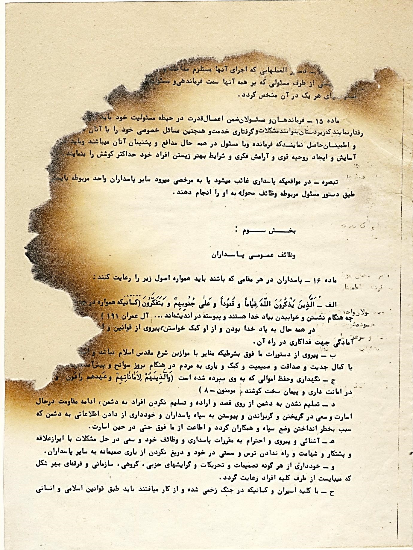 این سند نیمسوخته مربوط به اولین اساسنامه سپاه است که پس از شهادت شهید یوسف کلاهدوز قائممقام وقت فرمانده کل سپاه از کیف ایشان پیدا شد. آن زمان شهید یوسف کلاهدوز ازجمله اعضای شورای فرماندهی سپاه بود که بهطور مرتب روی تنظیم بندهای اساسنامه سپاه کار میکرد و همیشه یک نسخه از آن را همراه خود داشت. به دنبال شهادت ایشان و جمعی از فرماندهان عملیات ثامنالائمه (ع) این سند بهصورت نیمسوخته از کیف این شهید سعید بهدستآمده و توسط کارشناسان آرشیو مرکزترمیم و بازسازی گردیده است.