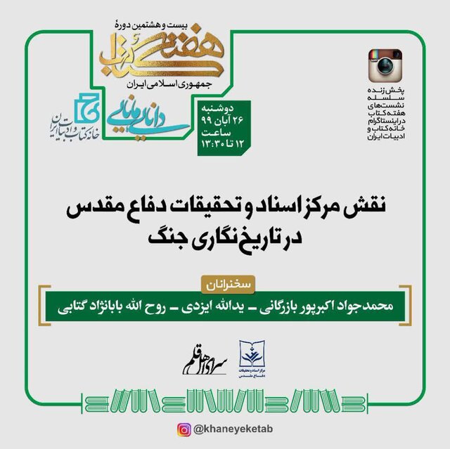 به همین منظور دوشنبه ۲۶ آبان ماه طی یک برنامه زنده اینستاگرامی با موضوع «نقش مرکز اسناد و تحقیقات دفاع مقدس در تاریخنگاری جنگ» با حضور محمدجواد اکبرپور بازرگانی جانشین این مرکز و مدیر مطالعات نظامی مرکز اسناد و تحقیقات دفاع مقدس، یدالله ایزدی راوی، تاریخ نگار جنگ و از پیشکسوتان و نویسندگان روزشمار و تاریخ شفاهی دفاع مقدس و روحالله بابانژاد گتابی مدیر روابط عمومی مرکز اسناد و تحقیقات دفاع مقدس به فعالیتها و نقش این مجموعه در حوزه دفاع مقدس میپردازند.
