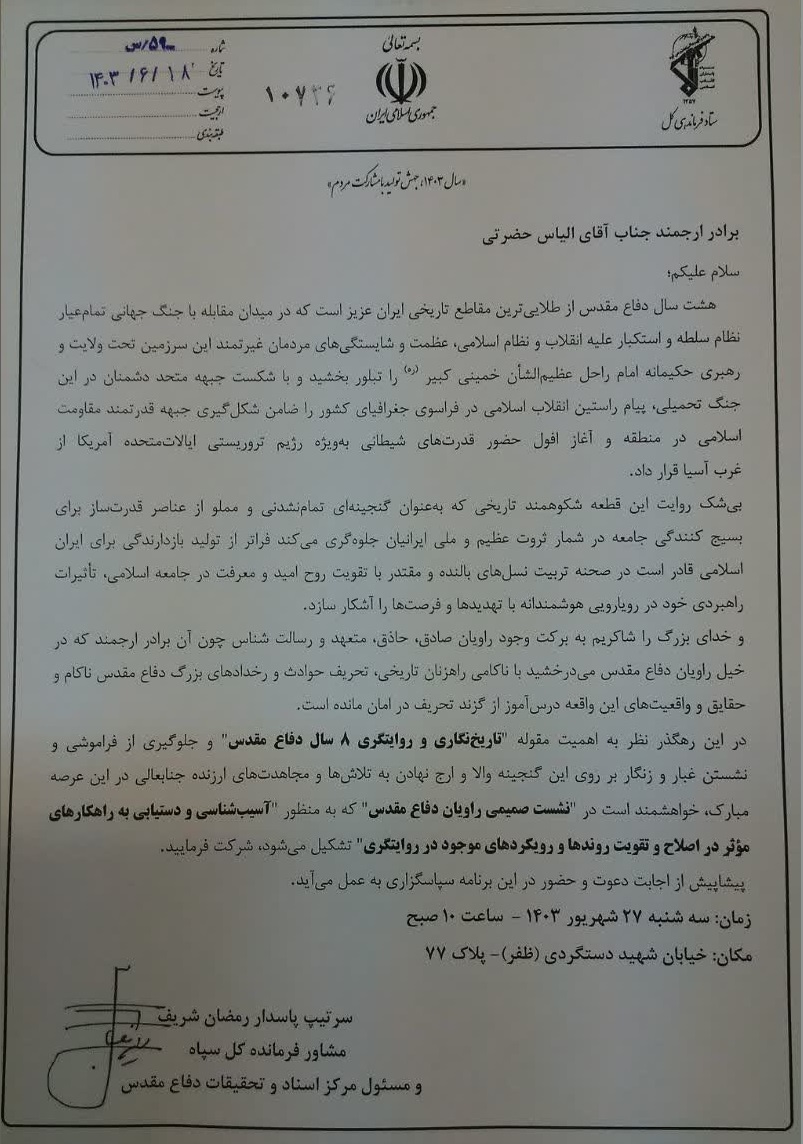 برادر ارجمند جناب آقای الیاس حضرتی؛ ضمن ارج نهادن به تلاش‌ها و مجاهدت‌های ارزنده جنابعالی در عرصه تاریخ‌نگاری و روایتگری ۸ سال دفاع مقدس"، خواهشمند است در "نشست صمیمی راویان دفاع مقدس" که به منظور "آسیب‌شناسی و دستیابی به راهکارهای مؤثر در اصلاح و تقویت روندها و رویکردهای موجود در روایتگری" تشکیل می‌شود، شرکت فرمایید.